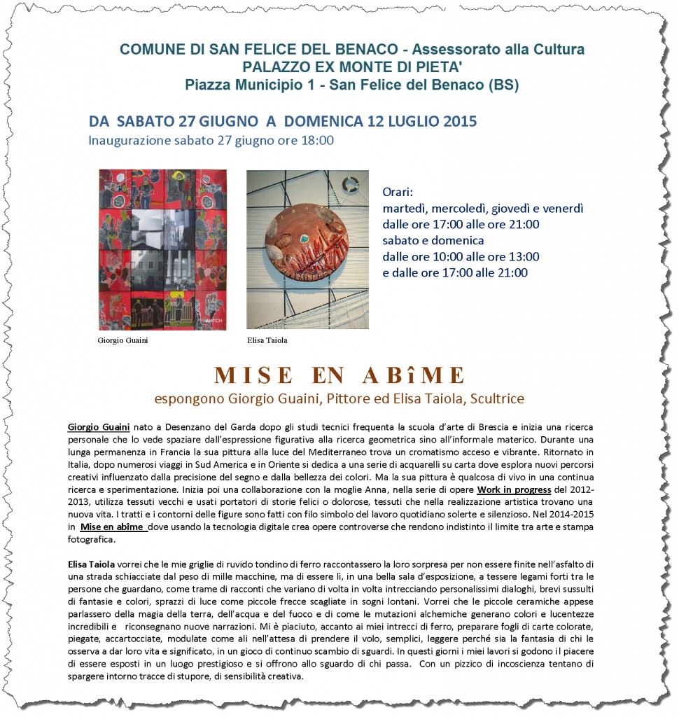Eventi San Felice Del Benaco 2015 8 giugno 2015 Giorgio 27 GIUGNO 2015 – ORE 18:00 INAUGURAZIONE NUOVI LAVORI DEL CICLO “MISE EN ABIME” PALAZZO EX MONTE DI PIETA’ piazza Municipio 1 – San Felice del Benaco (BS) la locandina dell’evento dove siamo