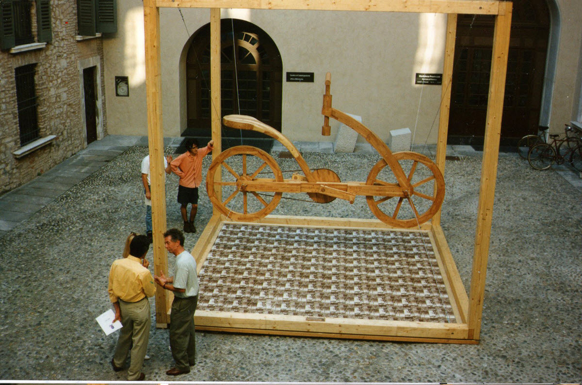 Nel 1994 il gruppo partecipa all’esposizione a Palazzo Martinengo a Brescia con un’istallazione colossale che viene posta nel cortile del palazzo: l’opera, un cubo di 4 metri di lato in legno contiene sospesa la riproduzione gigantesca pure in legno  della bicicletta che si suppone Leonardo Da Vinci disegnò nel codice atlantico. Il pavimento di questo enorme cubo è costituito da una serie di piastrelle raffiguranti l’episodio in cui i nostri grandi eroi del ciclismo Bartali e Coppi si scambiano amichevolmente la famosa fiaschetta d’acqua. Completava l’opera una serie di valigette che accompagnavano Leonardo nei viaggi immaginari per promuovere la produzione di questo nuovo mezzo di locomozione. Le valigette contenevano il necessario per il viaggio e una piccola sezione su pergamena del codice atlantico con il disegno originale della bicicletta .